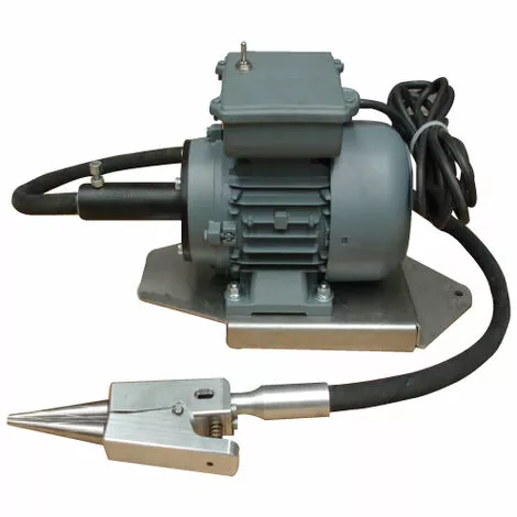 Mini plumeuse électrique à rouleaux en acier inoxydable entraînés par un arbre flexible sous gaine raccordé à un moteur (les rouleaux tournent pour arracher les sicots restant). Plumeuse équipée d’un moteur étanche avec interrupteur marche/arrêt incorporé et dotée d’un support orientable pour une bonne maniabilité.
