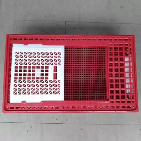 Cage de petite taille adaptée au transport de vos poules et autres petites volailles. En plastique rouge et blanc, elle est démontable, se range à plat. Dimensions : 77x57x27cm Contenance : 10 à 14 poules Nombre de portes : 2 Couleurs : rouge et blanc.
