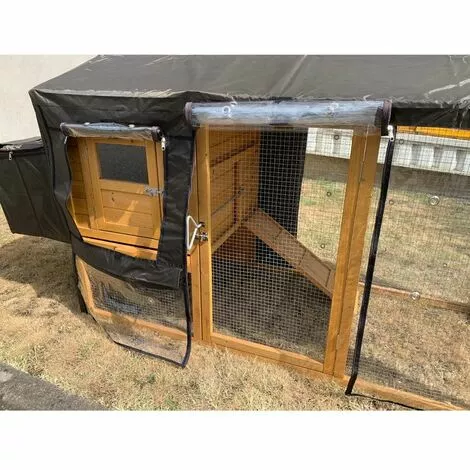 Housse de protection conçue pour le poulailler Chabo. Matières : tissu, plastique et métal Ouvertures zippées et scratchées Œillets d’aération en métal Adaptée sur mesure au poulailler Chabo Protège le poulailler, garde les poules au sec.