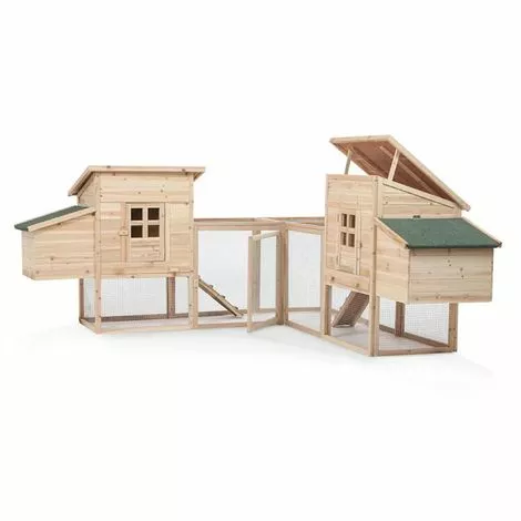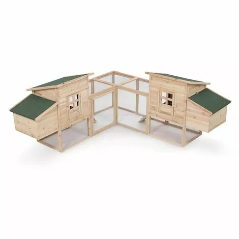 Vous souhaiteriez avoir des poules dans votre jardin, sans qu’elles ne se baladent partout ni qu’elles se sentent enfermées dans un poulailler trop petit ? Alors, optez pour ce poulailler. Il a été conçu de façon à laisser de la liberté aux poules, de se balader d’une partie à l’autre de celui-ci. Elles pourront profiter des différents coins de ce poulailler, que ce soit à l’ombre dans les petites maisonnettes en bois ou à l’extérieur derrière les espaces grillagés pour leur permettre d’avoir une vue sur le jardin & profiter du soleil. Ce poulailler sera parfait pour vos poules qui seront confortablement installées et pourront vous offrir de bons oeufs frais !