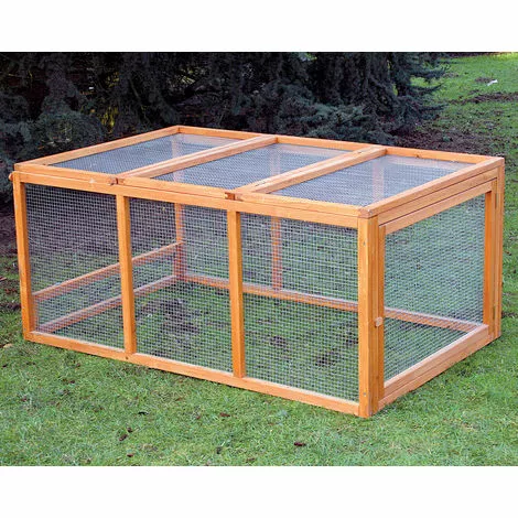 Ce parcours est prévu pour s’adapter sur de nombreux poulaillers. Le cadre en bois traité supporte un grillage de mailles 13 x 13 mm. Un petit rebord permet d’éviter que les poules ne partent sous le poulailler. Une porte en bout de parcours permet de laisser sortir les volailles tandis que le dessus s’ouvre sur les 2/3 pour un accès facile. Un panneau amovible permet de fermer entièrement le parcours, le transformant ainsi en une mue bien pratique. Dim. 150 x 93 x 67 cm.