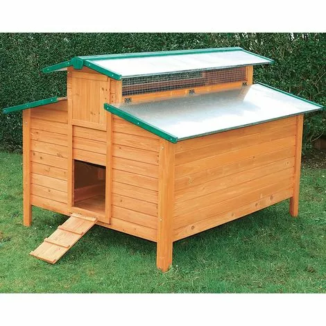 Grand, profond, entièrement équipé, ce poulailler vos étonnera par ses dimensions. Unique sur le marché, nous l’avons voulu fonctionnel et esthétique. Un côté est entièrement consacré aux pondoirs tandis que l’autre est équipé de perchoirs en espalier. Idéal pour les poules pondeuses, il est bien ventilé et équipé d’une sortie sur chaque façade avec trappe coulissante. Il peut être équipé de 1 ou 2 parcours universels. En bois teinté, il a une toiture en métal galvanisé. Livré en kit, très facile à monter.