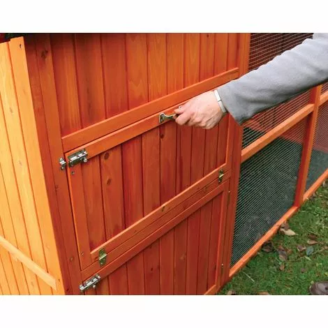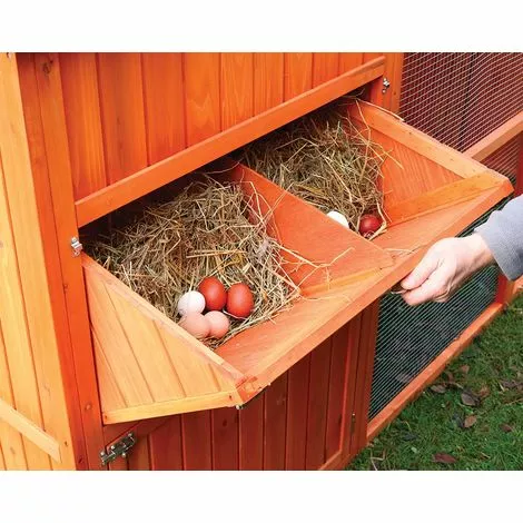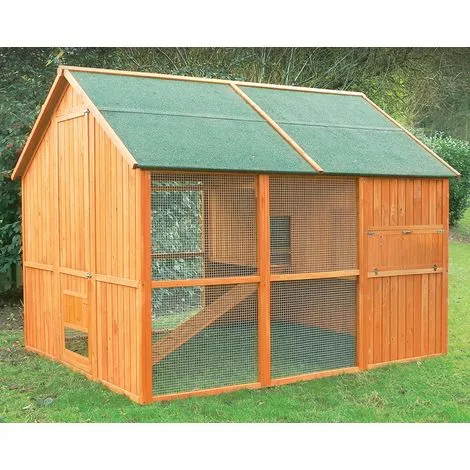 Très grand poulailler volière conçu à la fois pour apporter un maximum de confort aux poules et à leur propriétaire ! Pour les poules : Abri spacieux équipé d’un pondoir et de perchoirs, vaste volière protégée des courants d’air, accès au jardin par la trappe de sortie, aération réglable. Pour le propriétaire : Nettoyage facile et en hauteur de l’abri (tiroirs à déjections), volière haute, plus besoin de se plier en deux pour rendre visite à ses poules, trappes coulissantes équipables de portier électronique (en option), et surtout nouveau concept de pondoir interne à basculement qui facilite et sécurise le ramassage des œufs. Une porte de visite à l’arrière donne accès à l’abri. En bois teinté, toiture en toile goudronnée, livré en kit, assemblage facile.