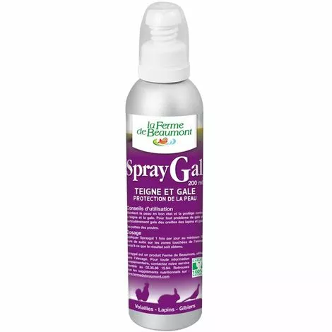 Le SprayGal de la Ferme de Beaumont est un spray sans gaz propulseur, en aluminium brossé, 200 ml, facile à appliquer. Maintient la peau en bon état et la protège contre la teigne et la gale. Pour tout problème de gale et particulièrement gale des oreilles des lapins et gale des pattes des poules. Dosage : appliquer Spraygal 1 fois par jour au minimum 10 jours de suite sur les zones touchées de l’animal jusqu’à ce que le résultat soit obtenu.