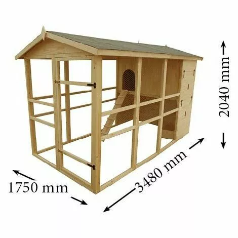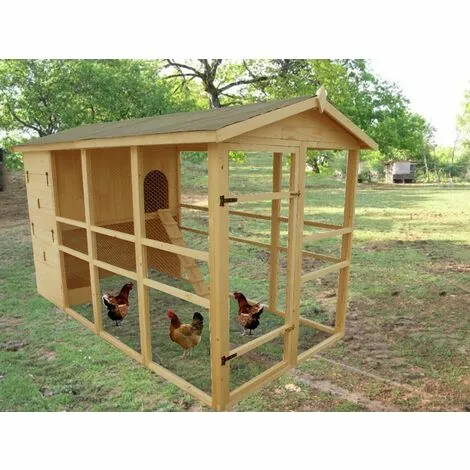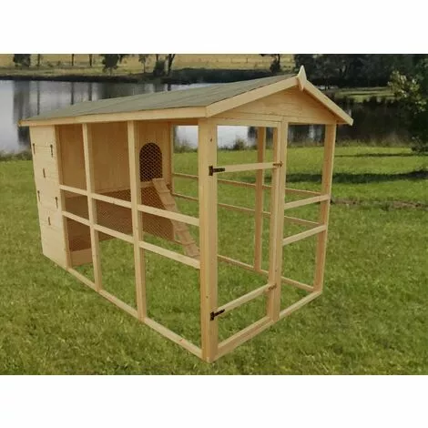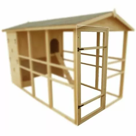Poulailler robuste très grande taille en épicéa équipé d’une rampe d’accès, d’un espace nuit, d’un poerchoir, d’une base volière, d’un pondoir avec porte d’accès et d’un grand parc grillagé.