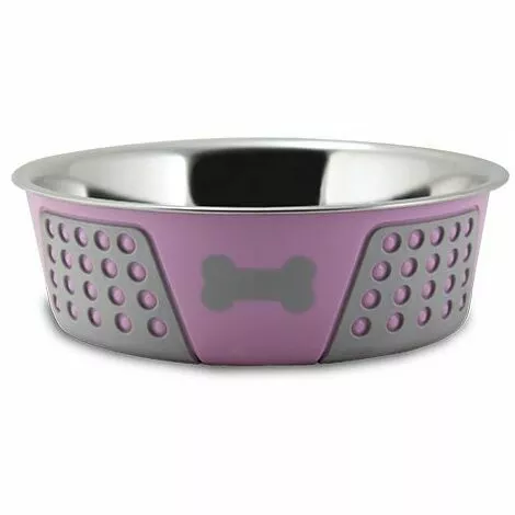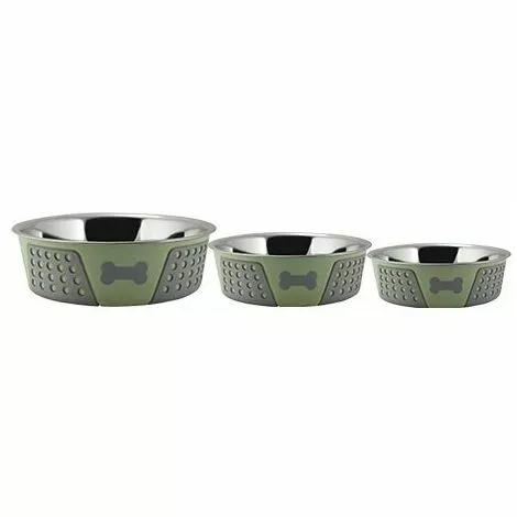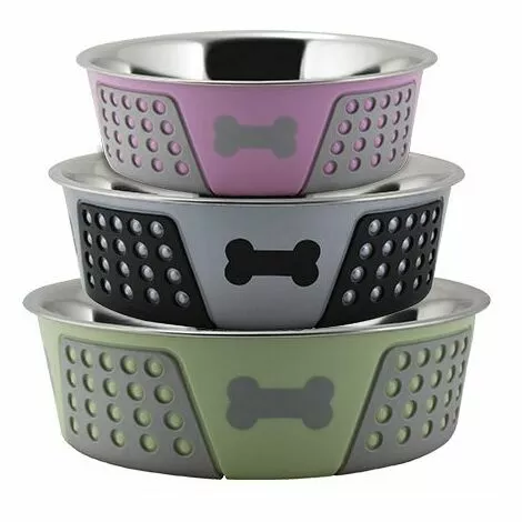 inoxydable et sont recouvertes de plastique et de caoutchouc à l’extérieur. Ces matériaux se combinent entre eux dans des couleurs différentes et sont décorés avec la silhouette d’un os. La base est entièrement recouverte de caoutchouc, ce qui la rend très stable et antidérapante, l’acier inoxydable est un matériau très résistant, hygiénique et facile à nettoyer. Ce modèle de mangeoires est disponible en 3 couleurs différentes avec 3 capacités différentes par couleur.