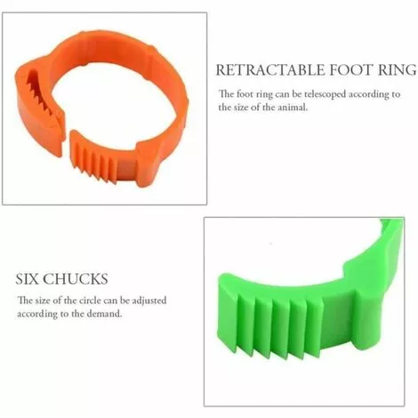 Anneaux de jambe réglables : l’anneau de pied contient six boucles, le diamètre intérieur est d’environ 1,8 à 2,6 cm. L’anneau de cheville peut être rétracté en fonction de la taille de l’animal. Un seul peut être utilisé, pas besoin de le remplacer.