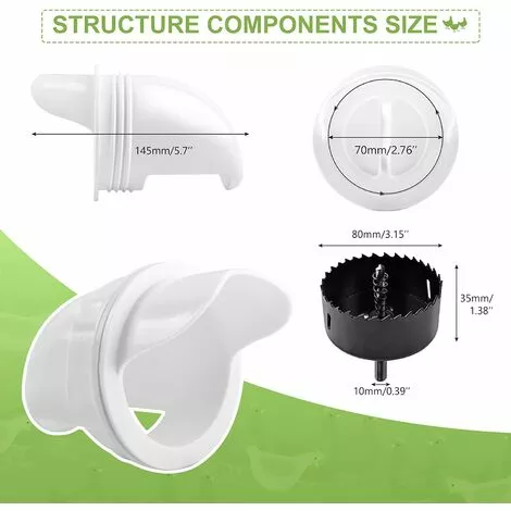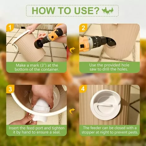 FACILE À INSTALLER: Il vous suffit de préparer le récipient et de percer, aucun matériel supplémentaire n’est requis, vous pouvez donc facilement assembler la mangeoire à poulet plastique en quelques minutes. Ce lot d’accessoires pour poulet kit comprend 4 jeux de mangeoires pour poulet et une scie cloche noire (3″).