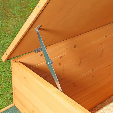 Ce poulailler magnifique et surtout bien pensé offre à vos poulets un logement adapté à l’espèce, avec des possibilités de retraite appropriées et la liberté de mouvement nécessaire. Le nichoir latéral avec un total de 2 nids et un couvercle qui peut être ouvert vers le haut offre beaucoup d’espace pour les poules et vous permet d’enlever les œufs frais sans grand effort. En séparant les nichoirs du reste de la grange, ils restent propres et permettent aux poulets de pondre sans être dérangés. À l’avant du poulailler, il y a une entrée verrouillable pour les poulets et une rampe par laquelle les poulets entrent en plein air. Les animaux sont protégés du froid et de l’humidité par la distance prévue entre le sol et le plancher du poulailler. Pour nettoyer le poulailler, vous pouvez ouvrir le toit grâce à ses charnières. La construction stable du toit en bois et la couverture imperméable supplémentaire offrent à vos poulets une protection sûre contre la pluie, la grêle et la neige et assurent une longue vie au poulailler.