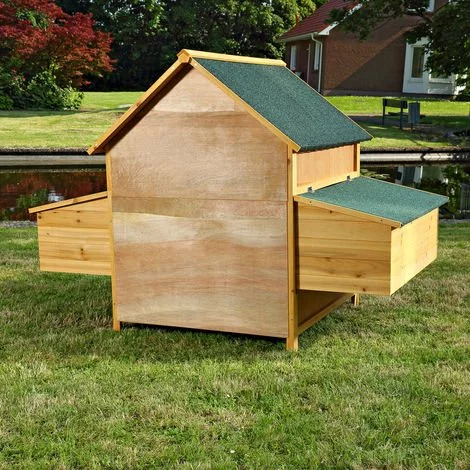 Ce poulailler magnifique et surtout bien pensé offre à vos poulets un logement adapté à l’espèce, avec des possibilités de retraite appropriées et la liberté de mouvement nécessaire. Les 2 nichoirs sur le côté avec un total de 4 nids et un couvercle qui peut être ouvert vers le haut offrent aux poules beaucoup d’espace et vous permettent d’enlever les œufs frais sans trop d’effort. En séparant les nichoirs du reste de la grange, ils restent propres et permettent aux poulets de pondre sans être dérangés. À l’avant du poulailler, il y a une entrée verrouillable pour les poulets et une rampe par laquelle les poulets entrent en plein air. Les animaux sont protégés du froid et de l’humidité par la distance prévue entre le sol et le plancher du poulailler. Pour nettoyer le poulailler, vous pouvez sortir le tiroir situé à l’arrière. La construction stable du toit en bois et la couverture imperméable supplémentaire offrent à vos poulets une protection sûre contre la pluie, la grêle et la neige et assurent une longue vie au poulailler.