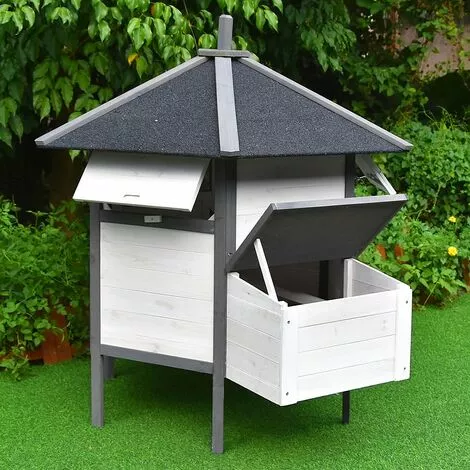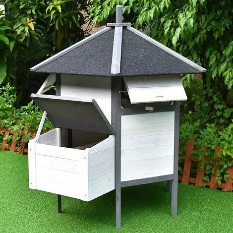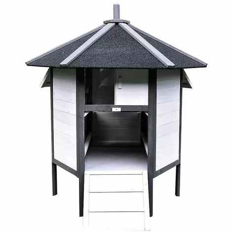 Ce poulailler élégant et surtout bien pensé offre à vos poulets un logement adapté à leur espèce, avec les possibilités de retraite correspondantes et la liberté de mouvement nécessaire. Le nichoir latéral peut être ouvert vers le haut pour retirer les œufs frais sans grand effort. En séparant les nichoirs du reste de la maison, les nichoirs restent propres et permettent aux poules de pondre sans être dérangées. À l’avant du poulailler, il y a une entrée fermée à clé pour les poules et une rampe, par laquelle les poules peuvent sortir. Grâce à la distance souhaitée entre le sol et le plancher du poulailler, les animaux sont protégés contre le froid et l’humidité. La construction du toit de l’étable en bois et une couverture étanche supplémentaire offrent à vos poulets une protection sûre contre la pluie, la grêle et la neige et garantissent une longue durée de vie du poulailler.