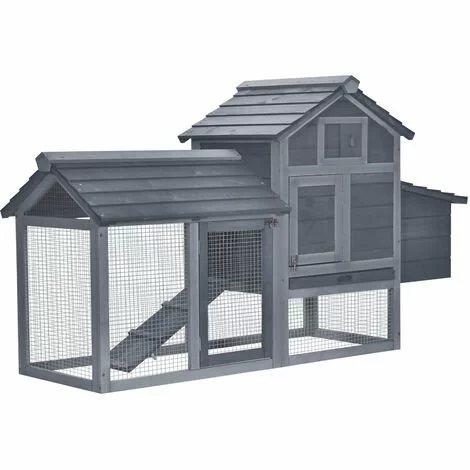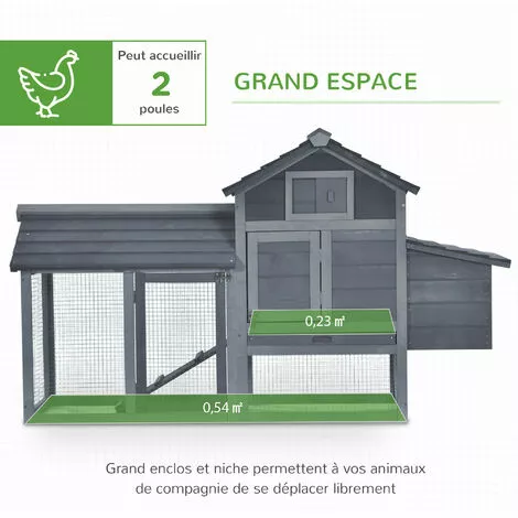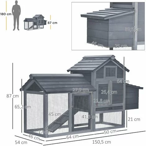 PawHut Petit Poulailler Cottage Cage à Poules Sur Pied Dim. 151L X 54l X 87H Cm Multi-équipement Bois Massif De Pin Gris