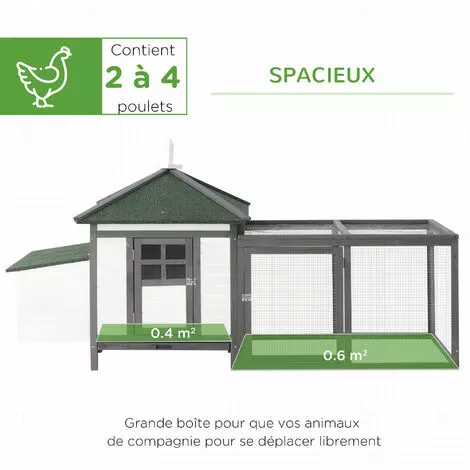 PawHut Poulailler Cottage Multi-équipement Perchoir Rampe Pondoir Enclos Tiroir à Déjection 196L X 76l X 97H Cm Bois Massif Pin Gris Blanc