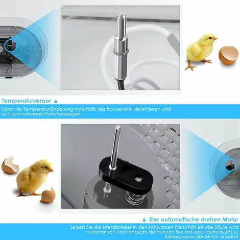 - 【Bon environnement de culture】La forme de l’incubateur assure une excellente homogénéité de l’humidité et de la température dans l’incubateur, ce qui fournit un environnement propice à l’incubation et garantit un taux d’incubation élevé. La couveuse a également pour fonction de retourner automatiquement les œufs, vous n’avez rien à faire, attendez que les poussins arrivent.