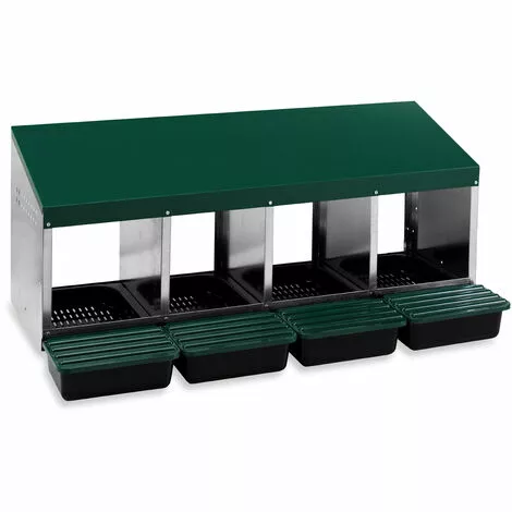 Pondoir équipé de 4 nichoirs avec fonds en plastique pour volailles. Dimensions : L106 x l52 x H48 cm Structure en métal galvanisé Fonds en plastique avec bacs de récupération Toit peint en vert Conçu pour être accroché à un mur ou monté sur des pieds Marque : Gaun