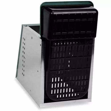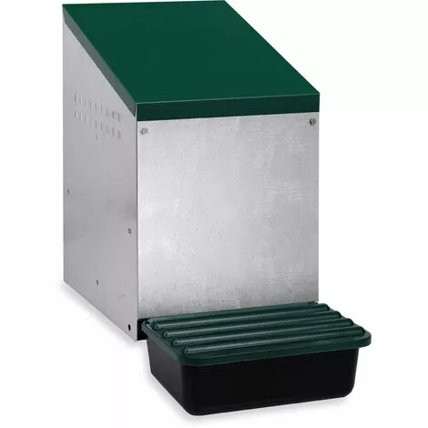 Pondoir pour poule en métal avec l’entrée à l’intérieur et le bac de récupération des œufs à l’extérieur. Dimensions : L52 x l27 x H48 cm Structure en métal galvanisé Fond en plastique avec bac de récupération Toit peint en vert Conçu pour être accroché à une paroi ou monté sur des pieds Marque : Gaun