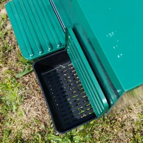Pondoir pour poule en métal comprenant trois nichoirs avec entrée à l’intérieur et bacs de récupération des œufs à l’extérieur. Dimensions : L80 x l52 x H48 cm Structure en métal galvanisé Fonds en plastique avec bacs de récupération Toit peint en vert Conçu pour être accroché à une paroi ou monté sur des pieds Marque : Gaun