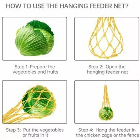 【Conception parfaite】 : Le filet d’alimentation suspendu peut facilement mettre toutes sortes de légumes et de fruits dans des poches et les accrocher dans la clôture ou le poulailler, empêchant les poulets de marcher sur la nourriture et de gaspiller de la nourriture, permettant aux poulets de manger des légumes et des fruits frais.