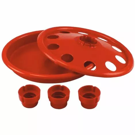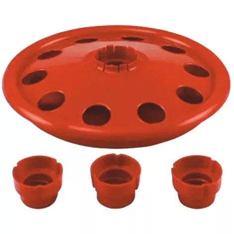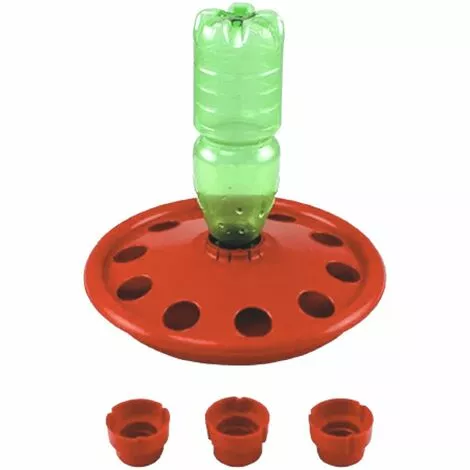 L’abreuvoir porte-bouteille pour poussins est facile à utiliser et s’adapte à tous les types de bouteilles disponibles sur le marché. Il peut être utilisé dans des petits troupeaux de 50 poussins maximum au cours des 6 premiers jours. L’abreuvoir à poussins est fabriqué dans une matière plastique soigneusement sélectionnée pour obtenir un produit de qualité, fonctionnel et flexible. Dans le choix des matériaux, River Systems se conforme à toutes les réglementations en vigueur concernant la protection de la santé animale et de l’environnement.L’abreuvoir est composé de deux parties distinctes, qui s’emboîtent l’une dans l’autre. Dans le disque supérieur, il y a un trou central sur lequel on peut fixer la bouteille. L’abreuvoir à poussins est fourni avec 3 adaptateurs, chacun ayant un diamètre et un filetage différents, qui conviennent à différents types de bouteilles en plastique.La taille des 10 trous dans lesquels les poussins boivent est telle qu’ils peuvent boire sans se mouiller ni tomber dans l’abreuvoir. De plus, les bords sont arrondis et finis pour éviter que les animaux ne soient blessés.La bouteille peut être remplie en la tirant hors de l’auge avec l’insert ou en la dévissant.Ce produit a été conçu pour accélérer les opérations habituelles d’approvisionnement par l’éleveur, ce qui permet d’économiser du temps et des ressources, et en même temps de permettre aux animaux de se désaltérer facilement dans un contexte de santé et de bien-être.