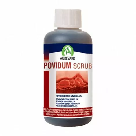 Povidum Scrub d’Audevard 750 est un savon nettoyant et désinfectant formulé à base de povidone iodée (concentré à 7,5%), efficace pour nettoyer et désinfecter la peau du cheval (plaies…).