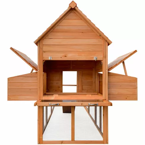 Le poulailler a des dimensions extérieures de 310 x 150 x 150 cm avec deux zones reliées. Comme la maisonnette se trouve sur un deuxième niveau auquel on accède par une rampe, la surface au sol reste entièrement préservée. La maison comporte deux grands nichoirs sur les côtés, chacun doté d’un couvercle rabattable. Les deux couvercles s’ouvrent en cas de besoin, ce qui permet d’accéder facilement à l’intérieur. Il est ainsi possible de jeter un coup d’œil aux poules qui nichent ou de retirer un œuf pour le petit-déjeuner. En dessous de la maison se trouve un bac galvanisé qui peut être retiré pour un nettoyage facile.