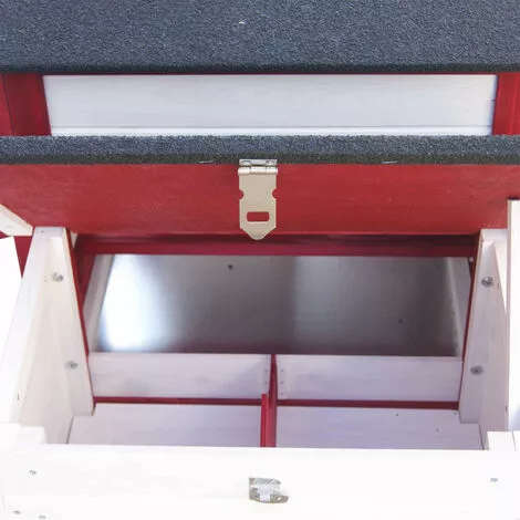 À côté de la maison, se trouve un nichoir en forme de cabane à l’étage supérieur, avec une surface de 270 x 520 cm, et qui se situe à l’extrémité de la construction, un peu en retrait, étant donné que c’est là que les poules peuvent se retirer pour couver en toute tranquillité. Pour un meilleur contrôle de la couvaison ou pour retirer les œufs frais, vous pouvez le faire aussi avec les deux mains libres ; il suffit d’ouvrir le clapet. Si nécessaire, vous pouvez fixer le toit à l’aide d’un support intégré, afin de le garder en position ouverte.