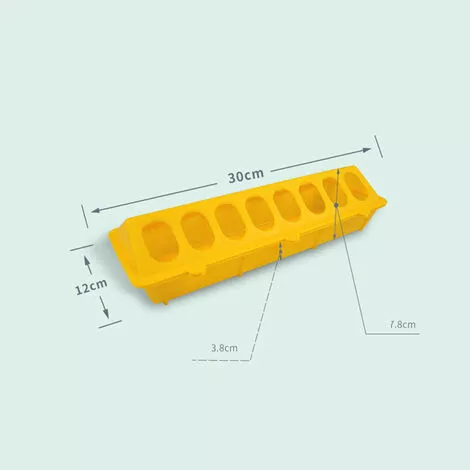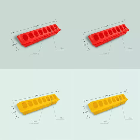 Nom : Abreuvoir long pour pigeons et pouletsMatériau : polypropylène copolymère modifiéTaille: 30cm * 12cm * 7.8cmPoids : 110gSpécification: 4pcs (2pcs jaune + 2pcs rouge)Caractéristiques:Belle couleur et beau travailNouvelle matière plastique sans ajoutFlexible, anti-chute, anti-soleil, solide et durable